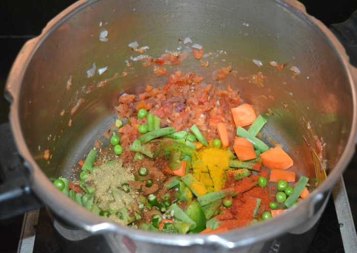 - Add chopped tomatoes and some salt. Saute the mixture for 2-3 minutes. Add chopped mixed vegetables, red chili powder, garam masala powder, coriander powder, turmeric powder, and remaining salt. Mix well. Saute the mixture for 2-3 minutes.