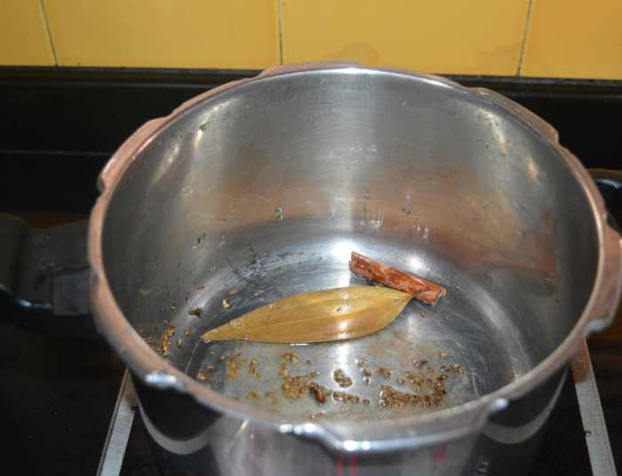 - In a pressure cooker, add ghee (or a mixture of ghee and oil). Heat it. Add cumin seeds, cinnamon stick, bay leaf, cloves, and cardamom. Saute on low heat until the cumin crackles.