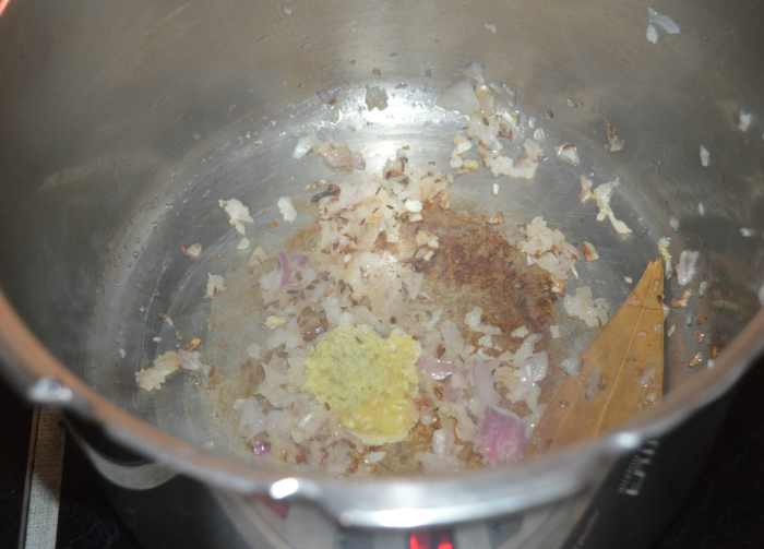 - Add chopped onions. Increase the heat. Saute until the onions become pinkish. Add ginger-garlic paste. Continue to saute until the raw smell escapes from the ginger-garlic paste.