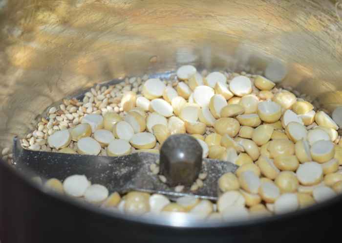 - When the sesame seeds become completely cold, add them to a mixer along with the fried gram. Make a coarse powder, transfer it to a bowl, and set aside.