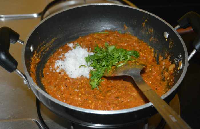 - Check for taste and consistency. Add red chili powder or salt, if needed. Also, add some water if needed to get the right consistency. This curry should be semi-solid. Mix well and turn off the heat.