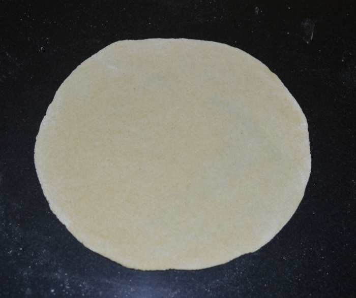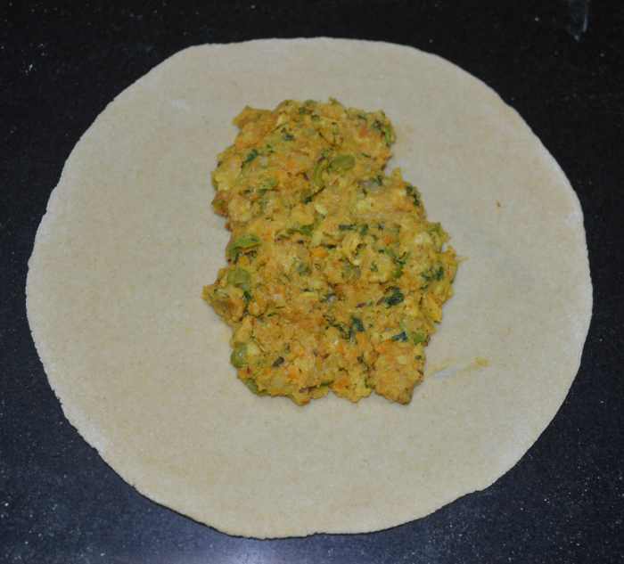 - Take one ball and one portion of filling. Make a patty out of the ball. Dust it with wheat flour. Roll it out to make a disc of 6 to 7 inches in diameter. Place the filling in the center.