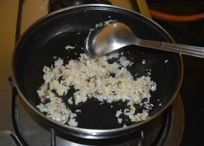 Add ginger-garlic paste. Saute until the raw smell goes away. Add chopped onions. Saute on high heat until the onions become pinkish.