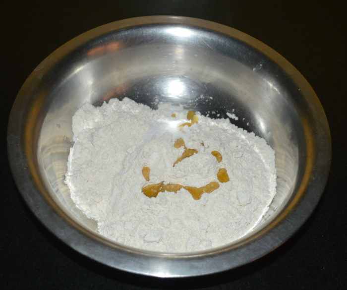 - In a large mixing bowl, add the wheat flour, all-purpose flour, baking soda or cooking soda, oil or melted ghee, and salt. Mix well.
