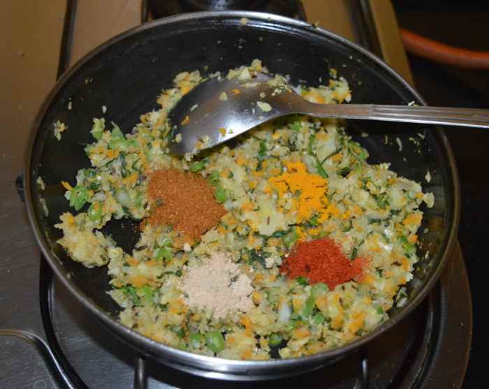 - Throw in the chopped veggies and some salt. Saute on high heat for 2 to 3 minutes. Reduce heat. Add the mashed potato and saute until well combined.