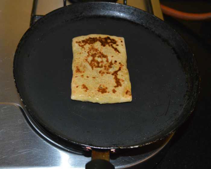 Step five: Heat a pan or griddle. Place a raw paratha in the center. Add a few drops of oil or melted ghee on top. Let the bottom side become golden brown. Flip it. Add oil or ghee on the top. Allow the other side to get golden brown spots, as well.
